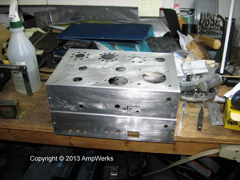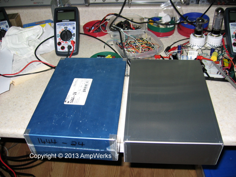 I started with a pair of blank Hammond 1444-24 chassis and bottom panels. Each chassis measures 8 x 12 x 3 inches and is aluminum with a natural finish.