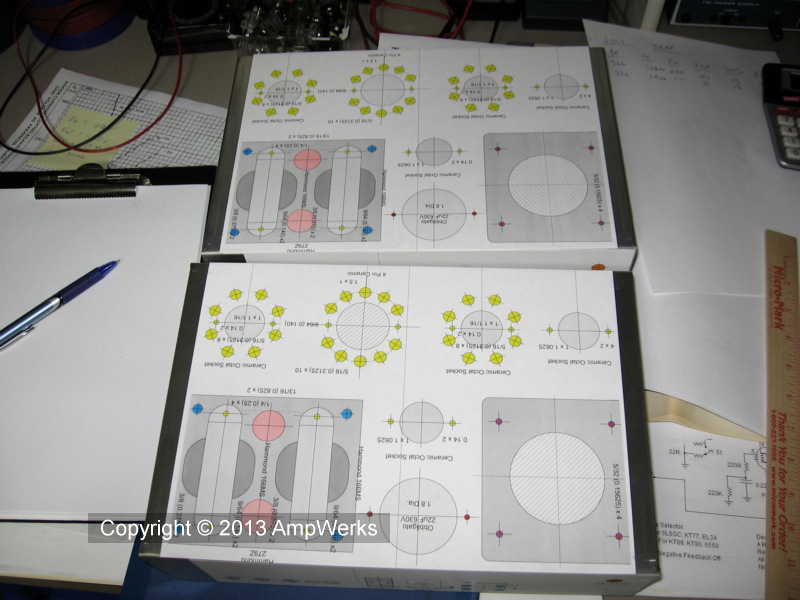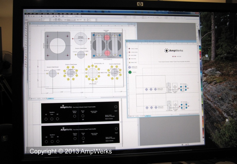 I created machining templates in Corel Draw for the front, top, back, and bottom panels. The templates are drawn to scale and act as guides for drilling and punching. The templates were printed on removable label stock and applied directly to the chassis panels.