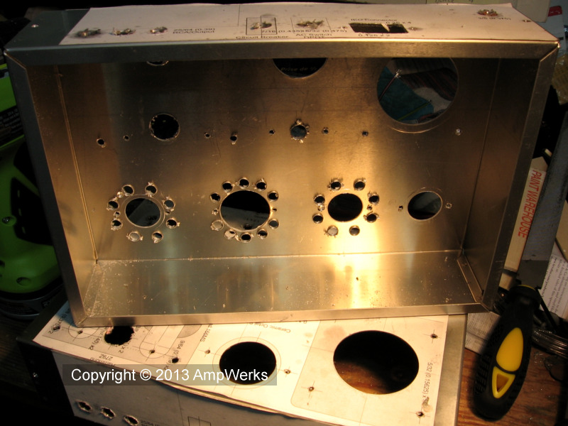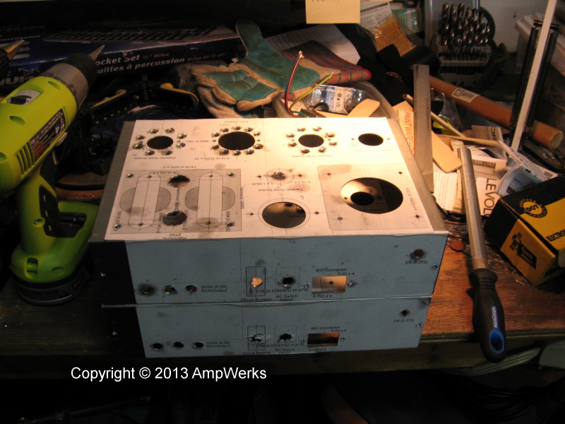 Most of the holes are round so I drillled them or punched them using Greenlee chassis punches of various sizes, but the rectangular hole for the IEC power cord connector on the back panel had to be made the hard way – drill and file.