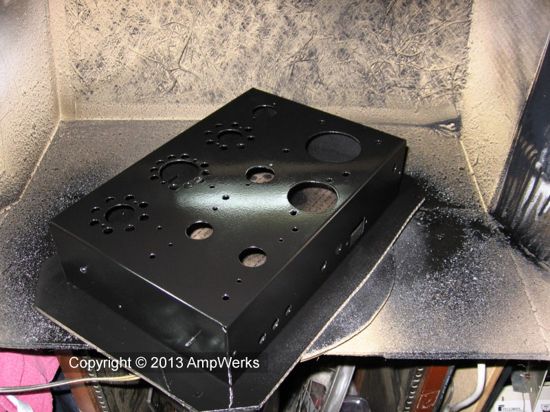 After drilling, punching and deburring I peeled the templates off and then wet sanded the two chassis. Next was degrease, primer, and up to four coats of black textured lacquer. Pictured below are the two chassis ready for primer.