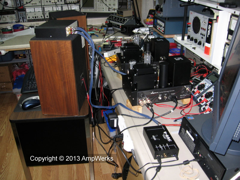 Here are the AA334s on the burn-in bench. Our trusty V-DAC plugged into the shop computer is providing music for our testing sessions. Sure beats listening to sine waves.
