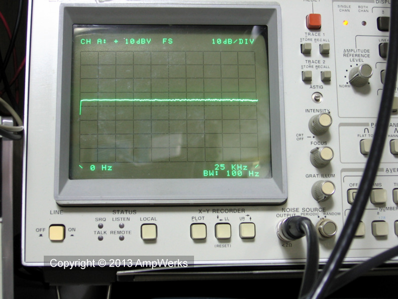 Below is the frequency response curve of one of the amplifiers measured at the 8 Ohm speaker terminals. The response is ruler flat up to 25 KHz. The measured -3 dB points are 20 Hz and 40 KHz.