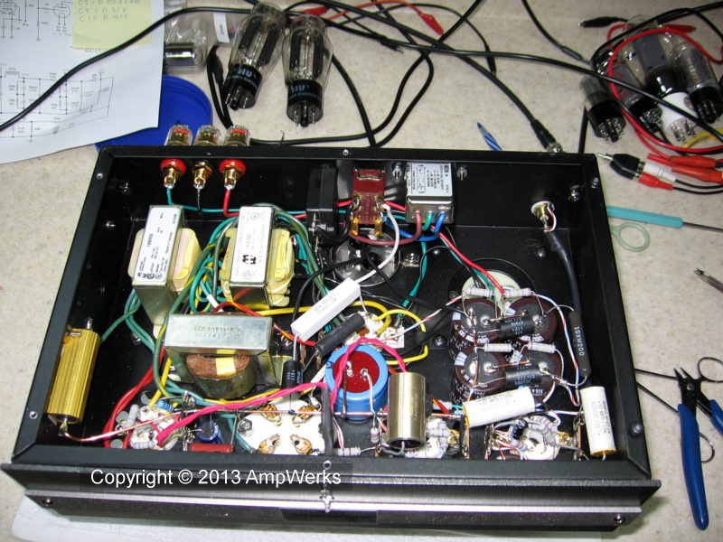 This is a bottom view of one of the AA334s with the pilot lights and the bypass caps installed. One of my design criteria was to use only traditional methods and components, hence the neon pilot lights rather than LEDs. The orange pilot indicates that power has been applied to the tube heaters, while the green pilot indicates that high voltage (B+) is present.
