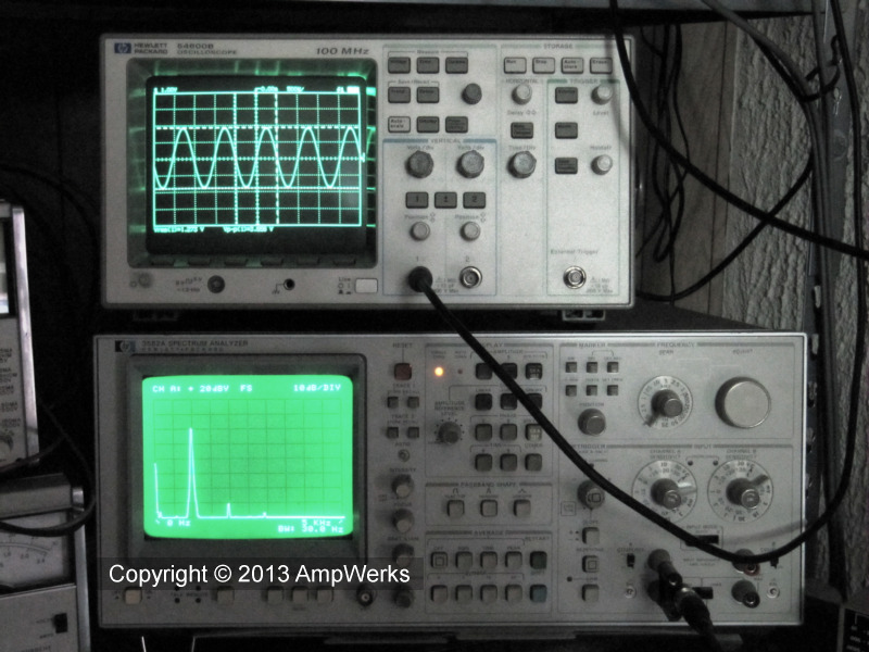 Here you can see the frequency distribution of a 1 KHz sine wave at 1 Watt into 8 Ω measured at the amplifier's output terminals. The spectrum analyzer's horizontal scale is zero to 5 KHz and the vertical scale is 10 dB per division. Second order harmonics are more than 50 dB down, and odd order harmonics are not even visible on the display. This is good.
